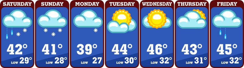 Now, onto the weather. Over in San Fresco Wharf, it’s looking like a cold and blustery stretch to start things off, with a messy mix at first and some light snow and flurries hanging around for the first part of the week. Then, later in the week, we finally get a little brighter break with a touch more sun and slightly milder afternoons before clouds and a few damp chances try to sneak back in.