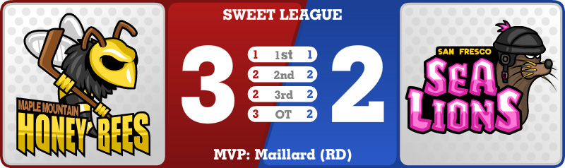 Final score, Maple Mountain Honey Bees 3, San Fresco Sea Lions 2. Winner, Maple Mountain. My two cents, teams that can stay level in a tie game and still find another gear in the third are going to steal points all season.