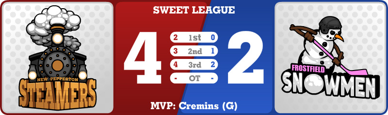Alright, on to the ice. New Pepperton came out humming and grabbed this one early. They are up 2 to 0 after the first, then Frostfield punches back to make it interesting, but the Steamers keep their structure. It is 3 to 1 after two, then New Pepperton closes it out 4 to 2 in the third without letting the Snowmen turn it into a track meet.